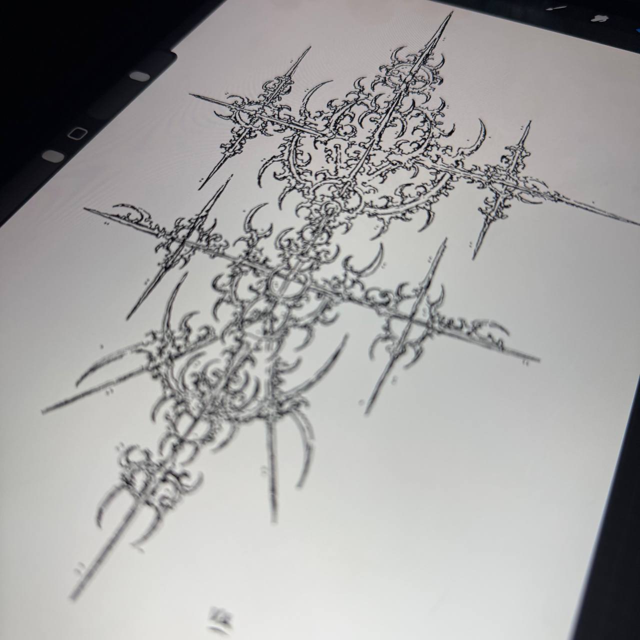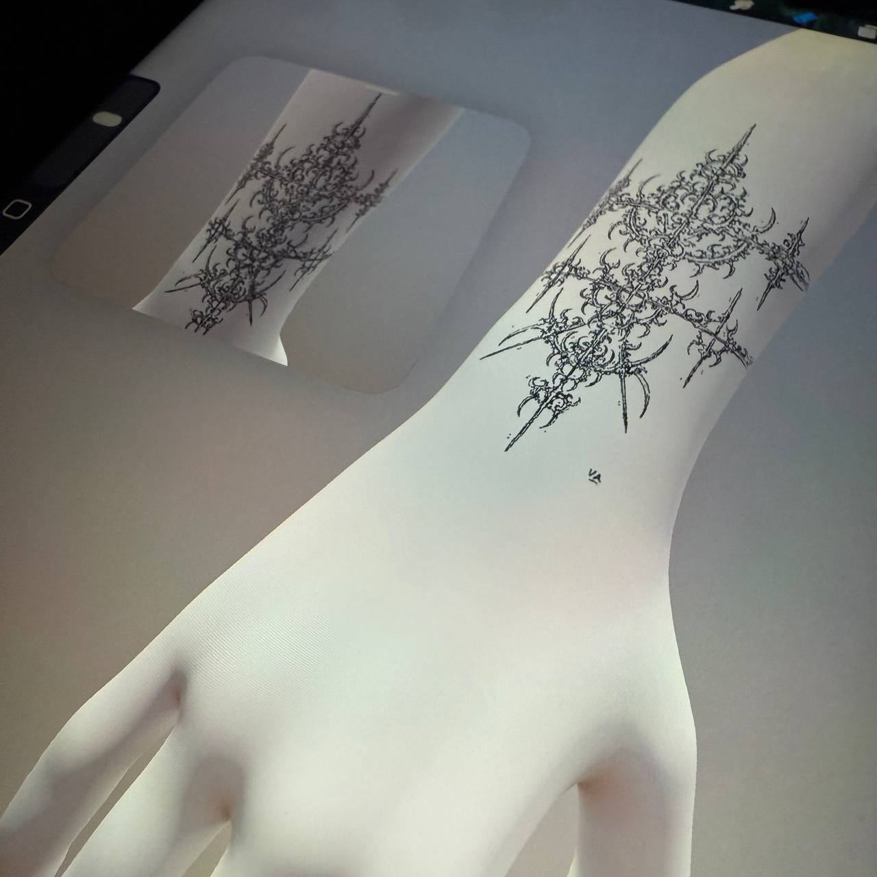 A finished tattoo design created in the cyber sigilism style. Digital symbols, distorted geometry, and encoded meaning.