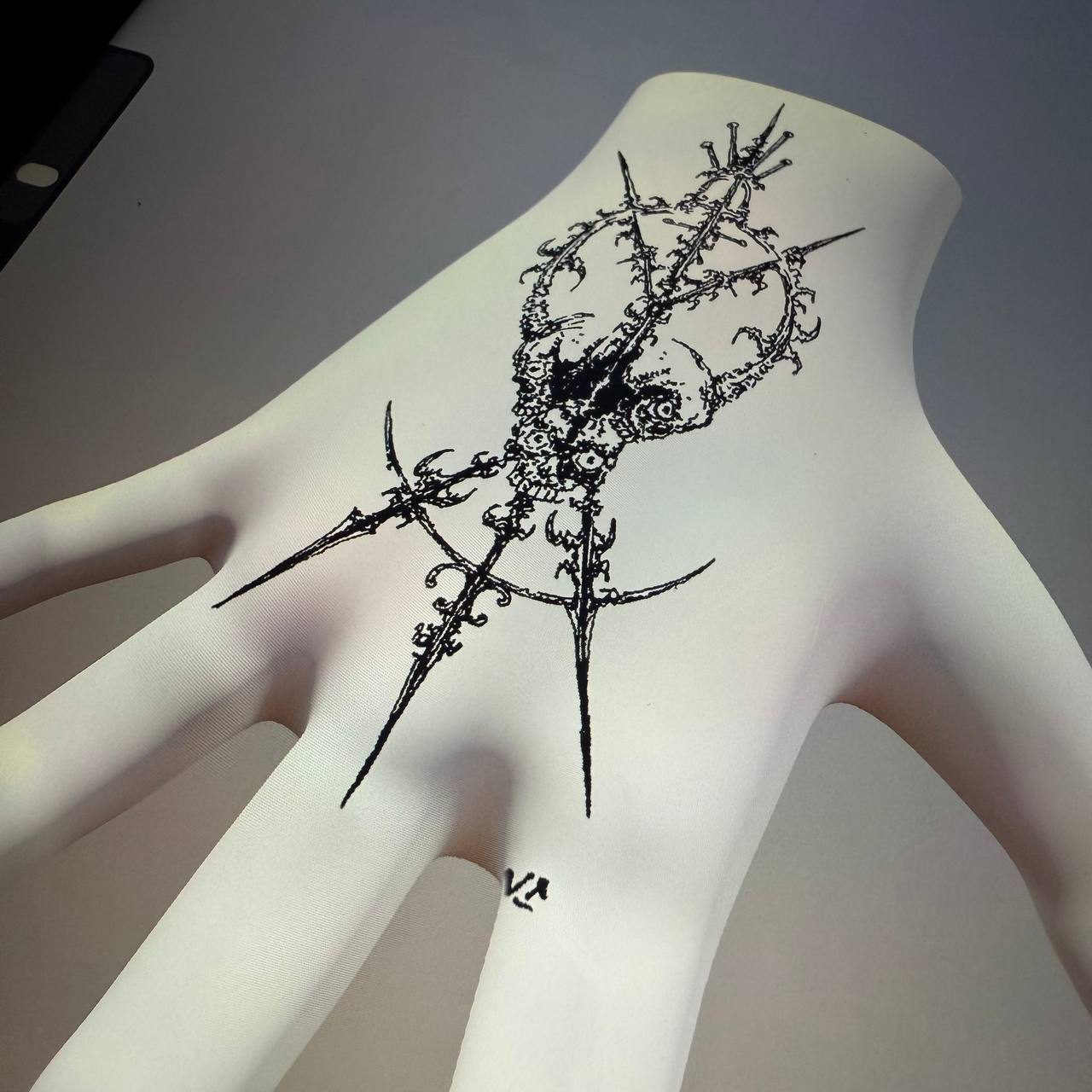 A finished tattoo design created in the cyber sigilism style. Digital symbols, distorted geometry, and encoded meaning.