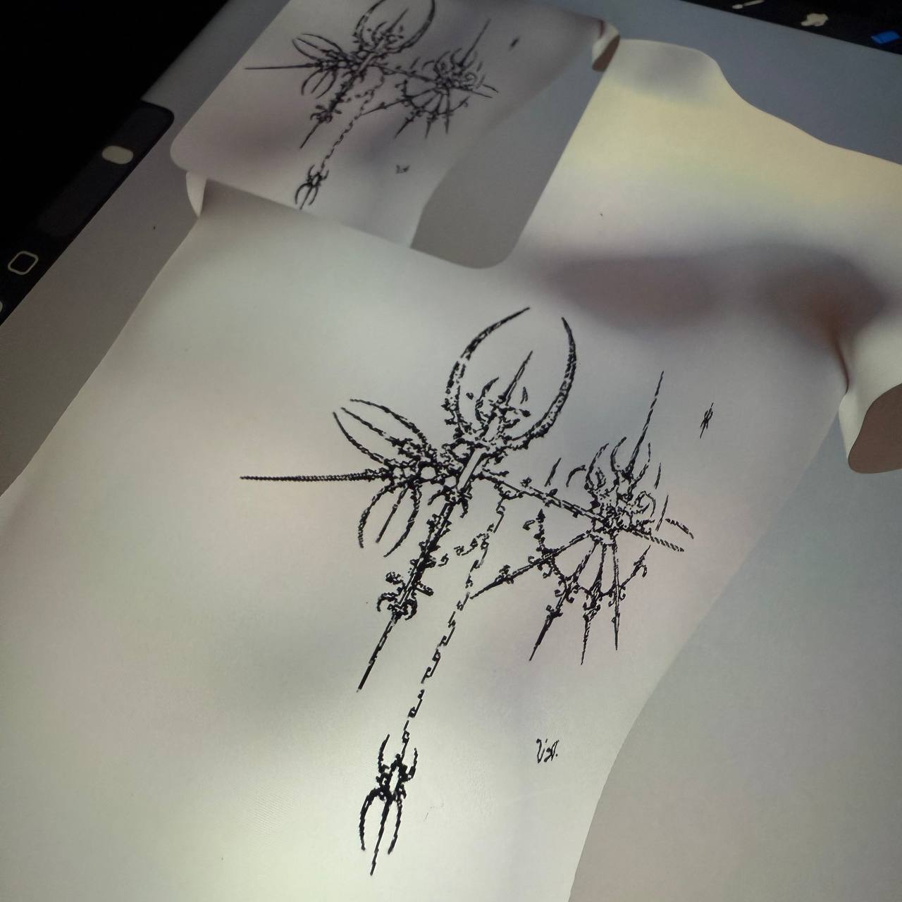 A finished tattoo design created in the cyber sigilism style. Digital symbols, distorted geometry, and encoded meaning.