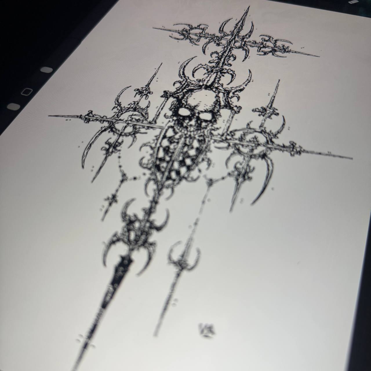A finished tattoo design created in the cyber sigilism style. Digital symbols, distorted geometry, and encoded meaning.
