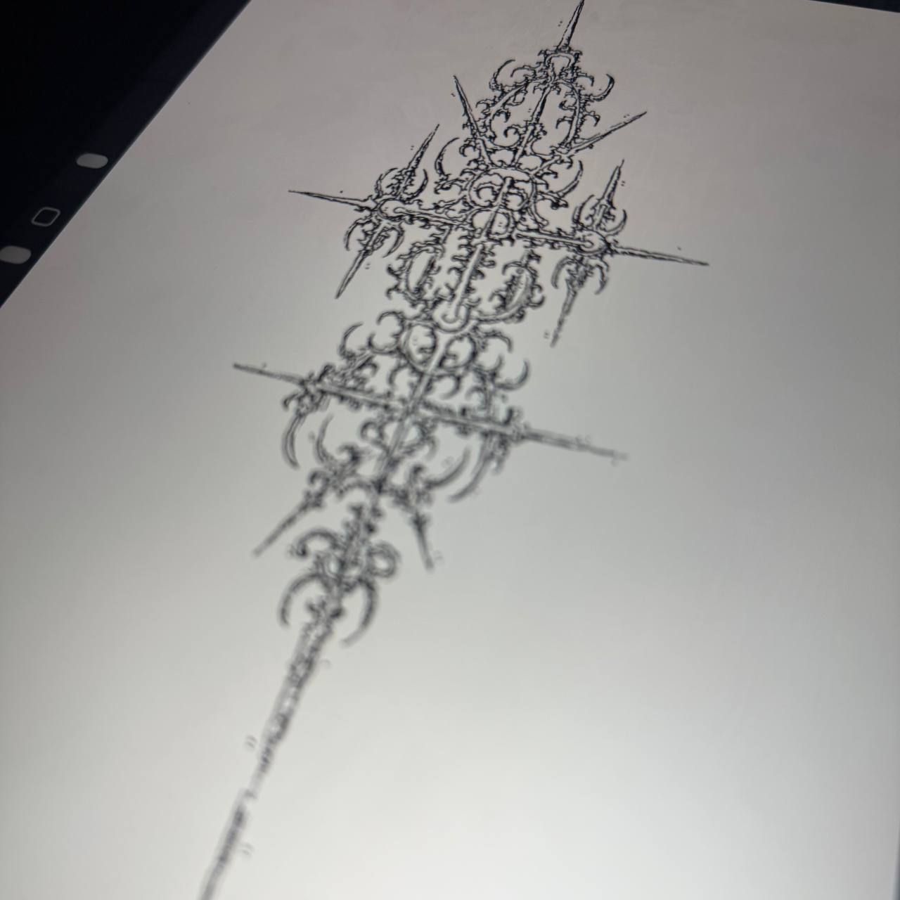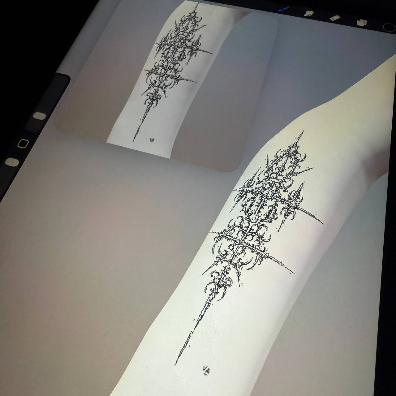 A finished tattoo design created in the cyber sigilism style. Digital symbols, distorted geometry, and encoded meaning.