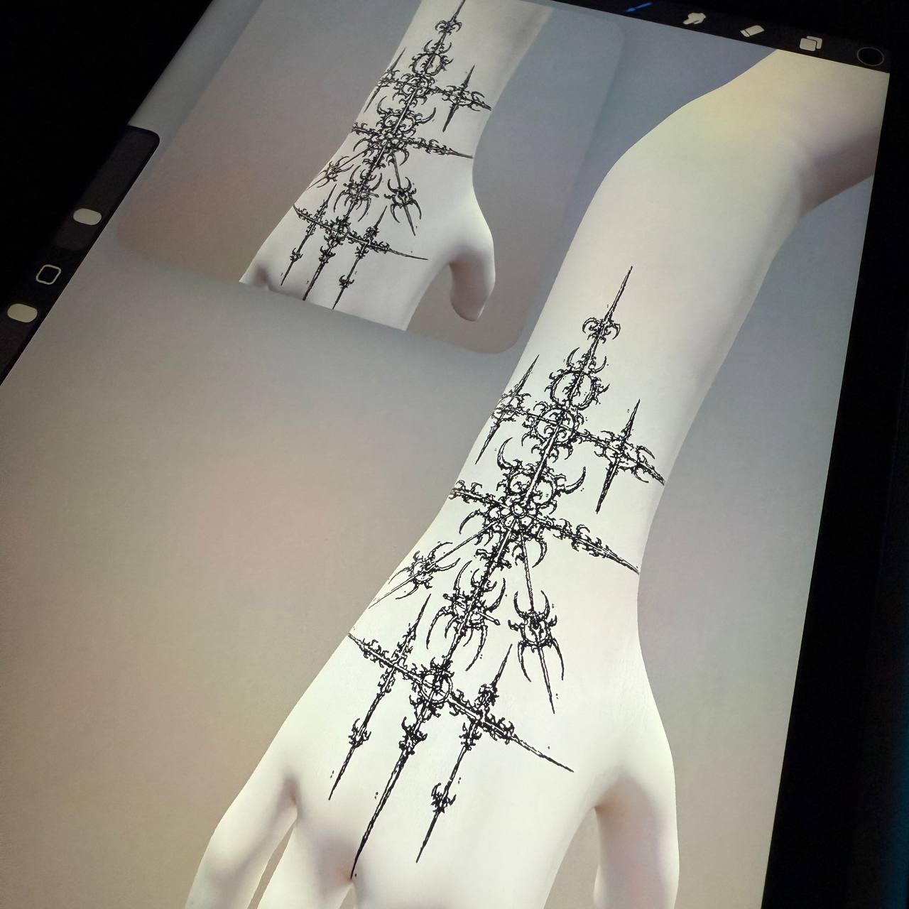 A finished tattoo design created in the cyber sigilism style. Digital symbols, distorted geometry, and encoded meaning.